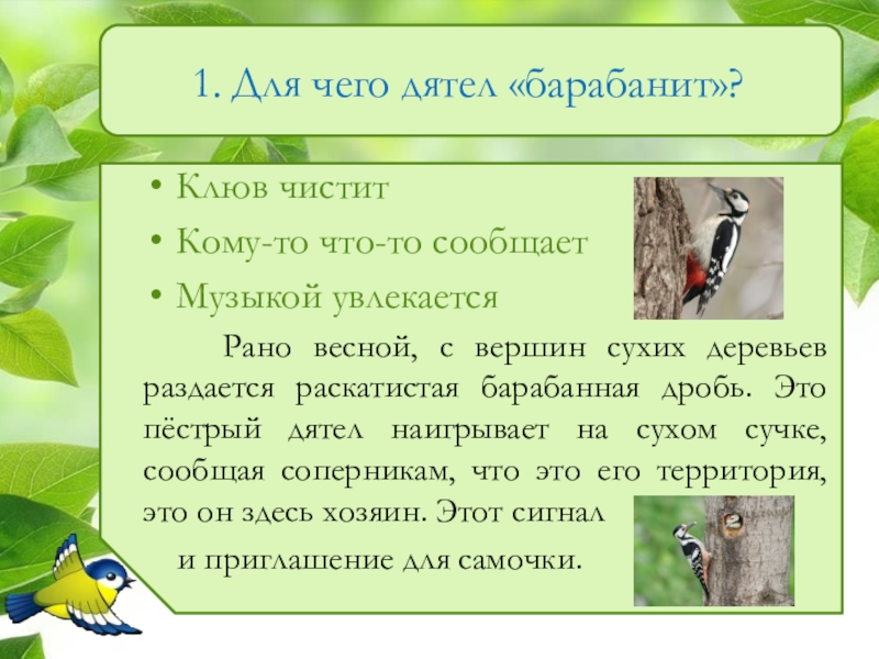 Слайд 21. Для чего дятел «барабанит»?