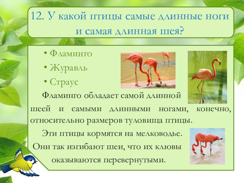 Слайд 1312. У какой птицы самые длинные ноги и самая длинная шея?