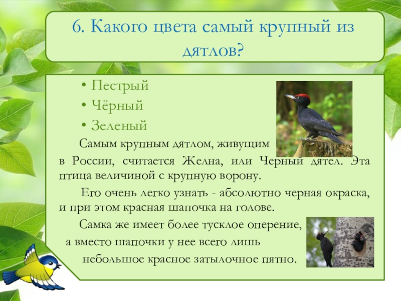 Слайд 76. Какого цвета самый крупный из дятлов?