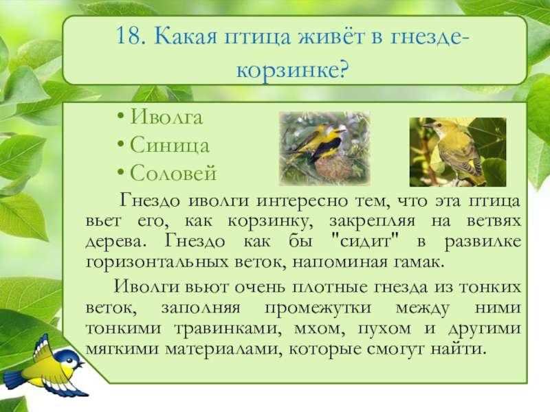 Слайд 1918. Какая птица живёт в гнезде-корзинке?