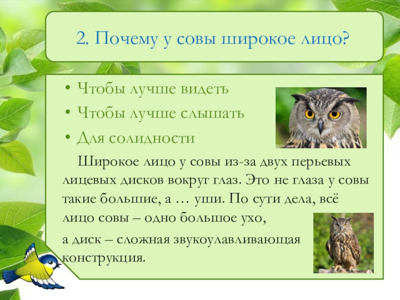 Слайд 32. Почему у совы широкое лицо?