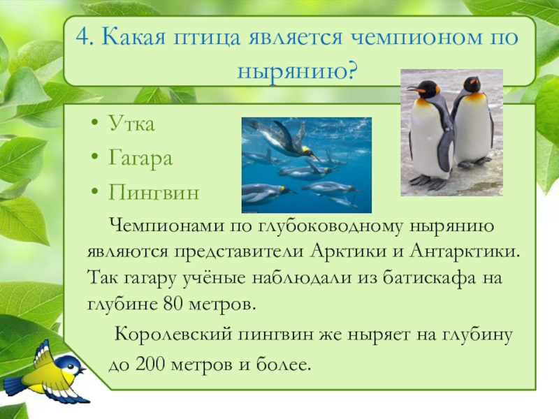 Слайд 54. Какая птица является чемпионом по нырянию?