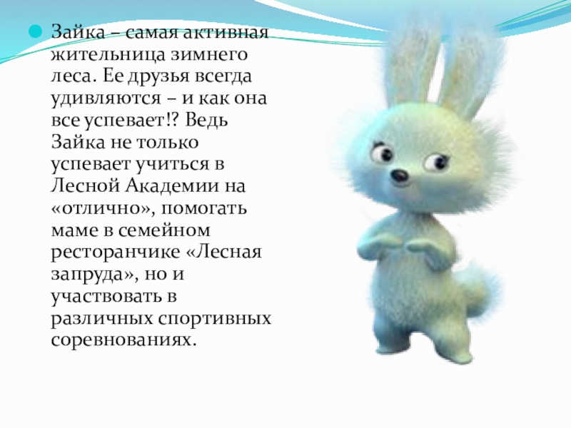 Слайд 10Зайка – самая активная жительница зимнего леса. Ее друзья всегда удивляются