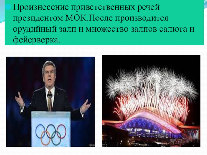 Слайд 24Произнесение приветственных речей президентом МОК.После производится орудийный залп и множество залпов