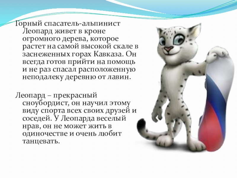 Леопард – прекрасный сноубордист, он научил этому виду спорта всех своих друзей и соседей. У Леопарда веселый нрав, он не может жить в одиночестве и очень любит танцевать.