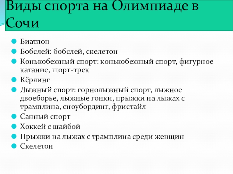 Слайд 17Виды спорта на Олимпиаде в Сочи