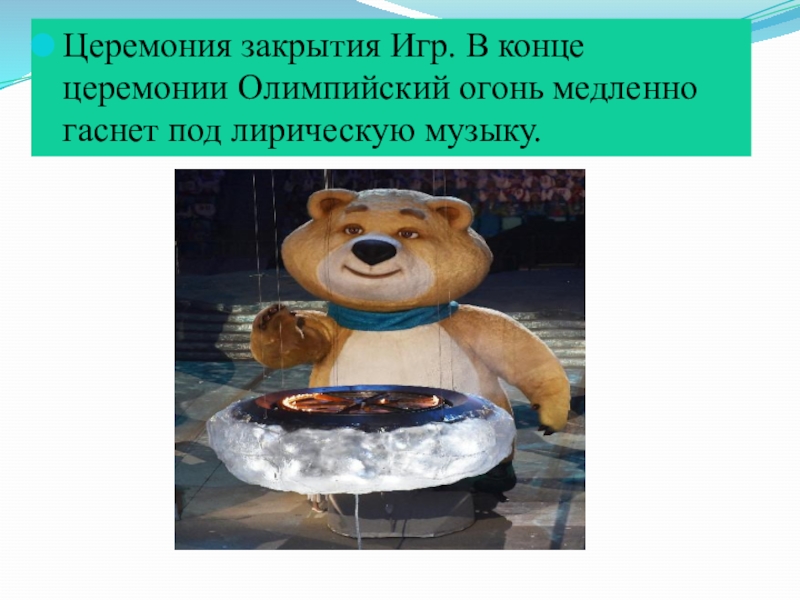 Слайд 31Церемония закрытия Игр. В конце церемонии Олимпийский огонь медленно гаснет под