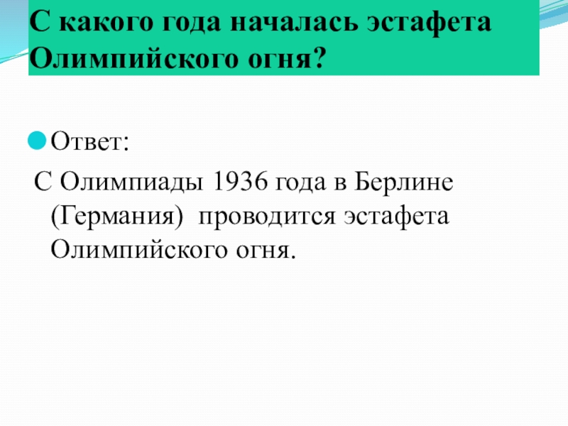 Слайд 13С какого года началась эстафета Олимпийского огня?