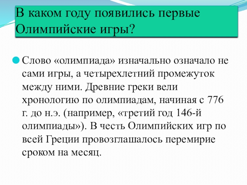 сами игры, а четырехлетний промежуток между ними. Древние греки вели хронологию по олимпиадам, начиная с 776 г. до н.э. (например, «третий год 146-й олимпиады»). В честь Олимпийских игр по всей Греции провозглашалось перемирие сроком на месяц.