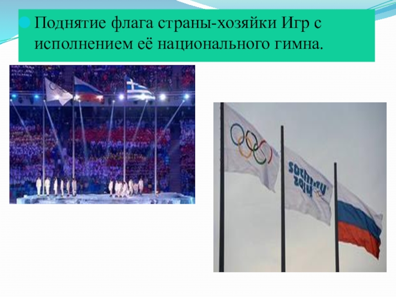 Слайд 26Поднятие флага страны-хозяйки Игр с исполнением её национального гимна.