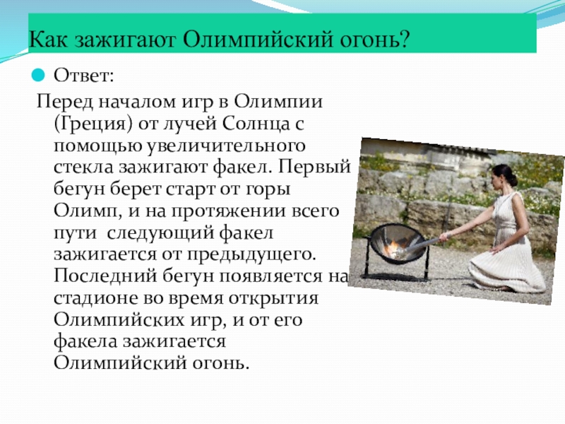 Солнца с помощью увеличительного стекла зажигают факел. Первый бегун берет старт от горы Олимп, и на протяжении всего пути следующий факел зажигается от предыдущего. Последний бегун появляется на стадионе во время открытия Олимпийских игр, и от его факела зажигается Олимпийский огонь.
