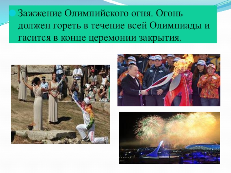 Слайд 30Зажжение Олимпийского огня. Огонь должен гореть в течение всей Олимпиады и