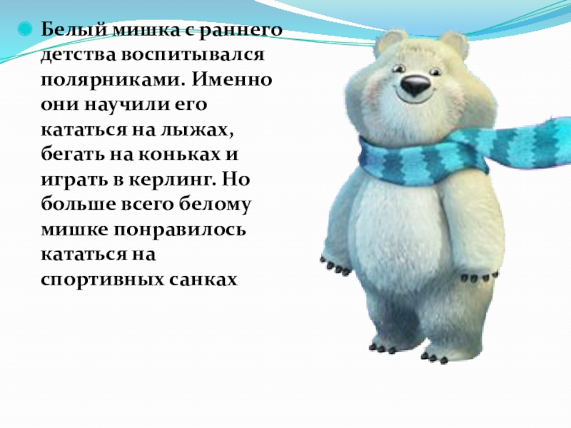 кататься на лыжах, бегать на коньках и играть в керлинг. Но больше всего белому мишке понравилось кататься на спортивных санках