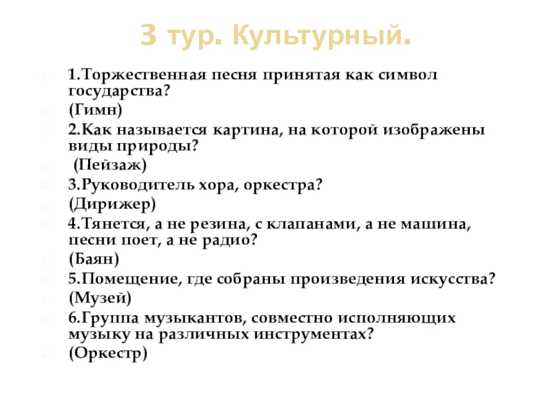 3 тур. Культурный. 1.Торжественная песня принятая как символ государства? (Гимн)2.Как называется картина, на которой изображены виды природы?