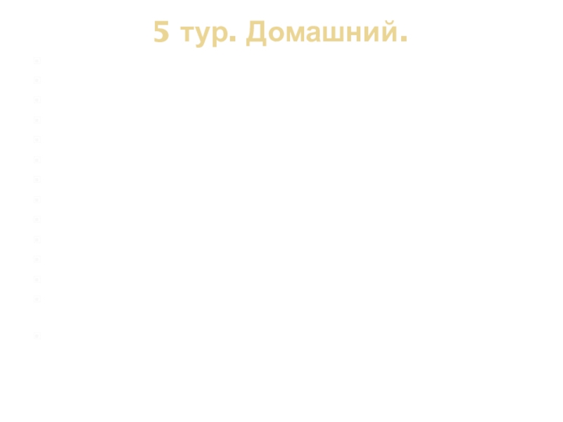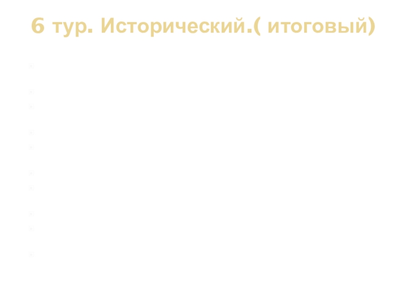 6 тур. Исторический.( итоговый) 1.В какой праздник показывали кукольный спектакль в Вифлеемском ящике?(В Рождество Христово)2.На какой праздник