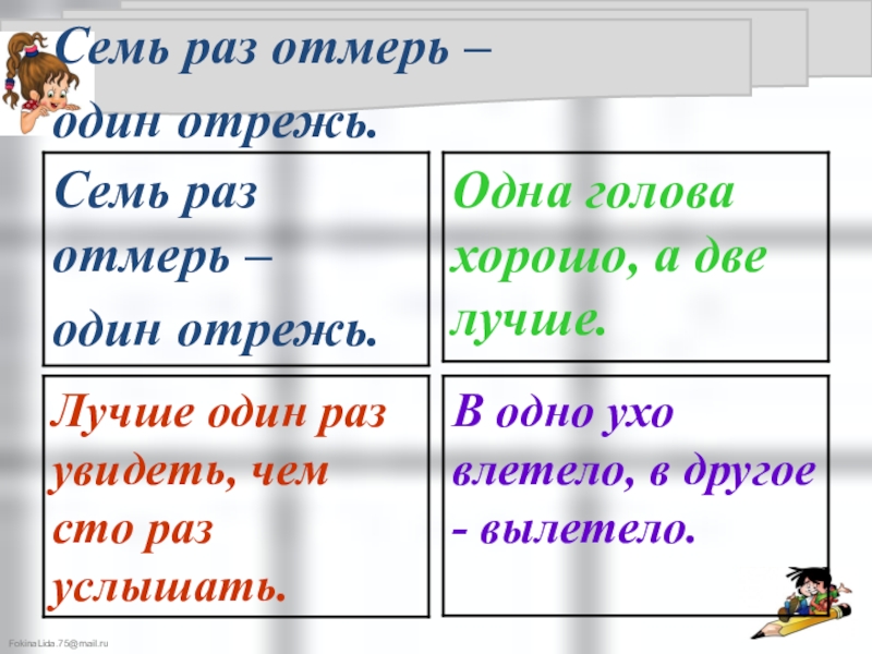 СЕМЬСЕМЬРАЗ- ОДИНОТМЕРЬОТРЕЖЬГОЛОВАОДНАХОРОШОЛУЧШЕ, АДВЕЛУЧШЕОДИНРАЗУВИДЕТЬУСЛЫШАТЬ, ЧЕМРАЗСТОВЛЕТЕЛОВ, ВОДНОУХО- ВЫЛЕТЕЛОДРУГОЕ