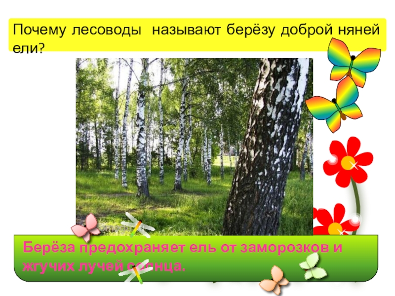 Слайд 6Берёза предохраняет ель от заморозков и жгучих лучей солнца.