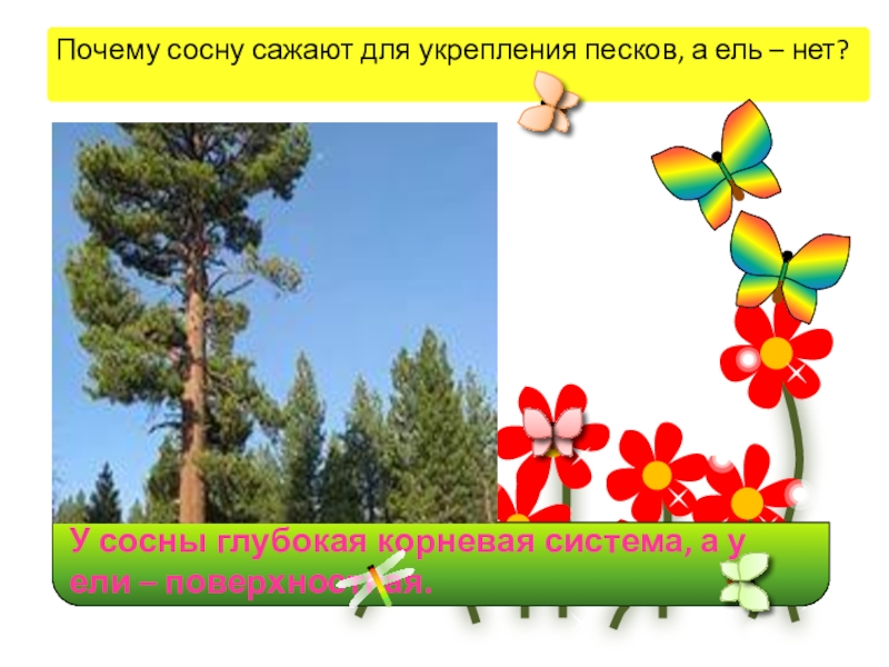 У сосны глубокая корневая система, а у ели – поверхностная.Почему сосну сажают для укрепления песков, а ель