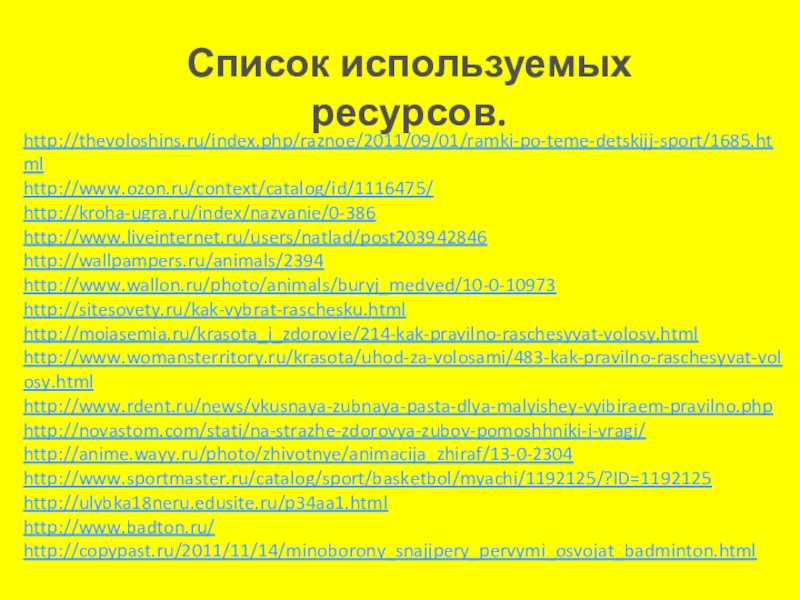 Список используемых ресурсов.http://thevoloshins.ru/index.php/raznoe/2011/09/01/ramki-po-teme-detskijj-sport/1685.htmlhttp://www.ozon.ru/context/catalog/id/1116475/http://kroha-ugra.ru/index/nazvanie/0-386http://www.liveinternet.ru/users/natlad/post203942846http://wallpampers.ru/animals/2394http://www.wallon.ru/photo/animals/buryj_medved/10-0-10973http://sitesovety.ru/kak-vybrat-raschesku.htmlhttp://moiasemia.ru/krasota_i_zdorovie/214-kak-pravilno-raschesyvat-volosy.htmlhttp://www.womansterritory.ru/krasota/uhod-za-volosami/483-kak-pravilno-raschesyvat-volosy.htmlhttp://www.rdent.ru/news/vkusnaya-zubnaya-pasta-dlya-malyishey-vyibiraem-pravilno.phphttp://novastom.com/stati/na-strazhe-zdorovya-zubov-pomoshhniki-i-vragi/http://anime.wayy.ru/photo/zhivotnye/animacija_zhiraf/13-0-2304http://www.sportmaster.ru/catalog/sport/basketbol/myachi/1192125/?ID=1192125http://ulybka18neru.edusite.ru/p34aa1.htmlhttp://www.badton.ru/http://copypast.ru/2011/11/14/minoborony_snajjpery_pervymi_osvojat_badminton.html