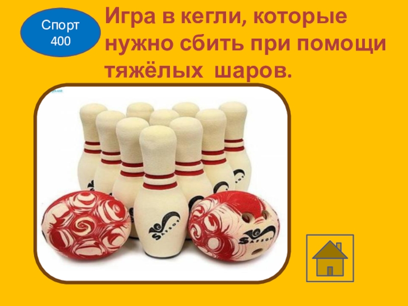 Спорт400Игра в кегли, которые нужно сбить при помощи тяжёлых шаров.