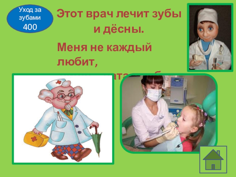Уход за зубами400Этот врач лечит зубы и дёсны.Меня не каждый любит, чиню - латаю зубы.