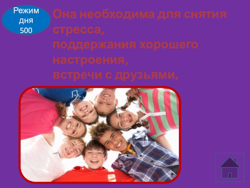 Режим дня500Она необходима для снятия стресса, поддержания хорошего настроения,встречи с друзьями, отдыха.