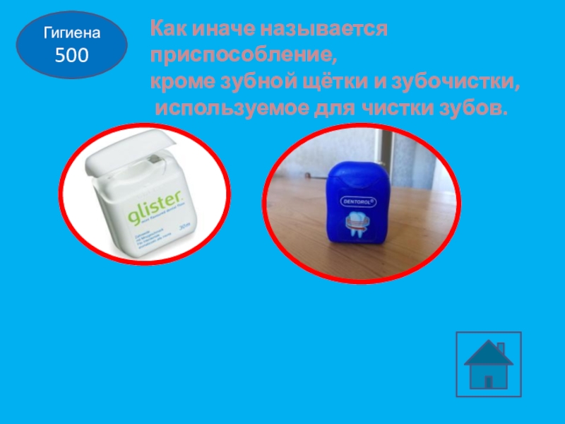 Гигиена500Как иначе называется приспособление, кроме зубной щётки и зубочистки, используемое для чистки зубов.