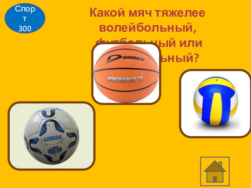 Спорт300Какой мяч тяжелее волейбольный, футбольный или баскетбольный?