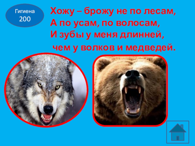 Гигиена200Хожу – брожу не по лесам,А по усам, по волосам,И зубы у меня длинней, чем у волков