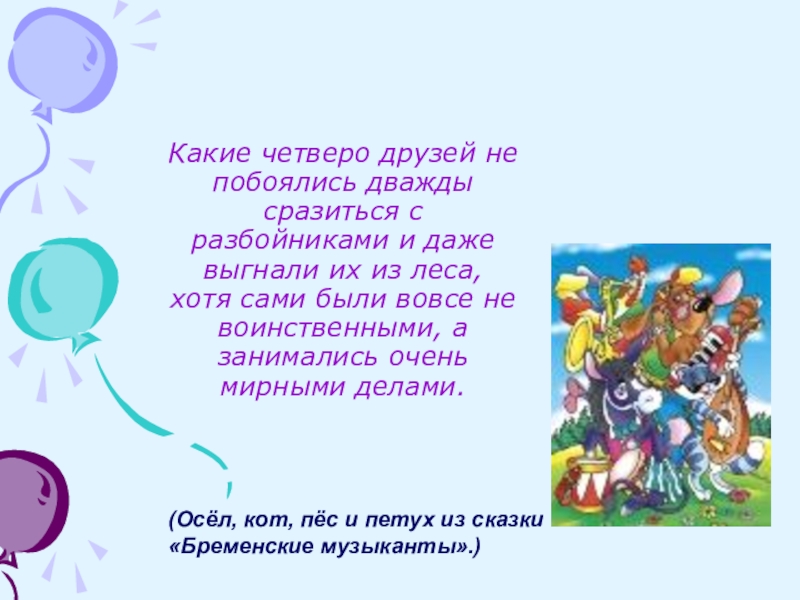 (Осёл, кот, пёс и петух из сказки «Бременские музыканты».)