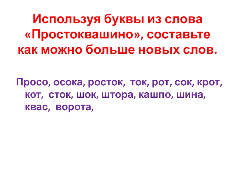 Просо, осока, росток, ток, рот, сок, крот, кот, сток, шок, штора, кашпо, шина, квас, ворота,