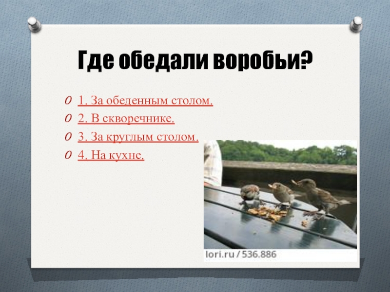 Где обедали воробьи?1. За обеденным столом.2. В скворечнике.3. За круглым столом.4. На кухне.