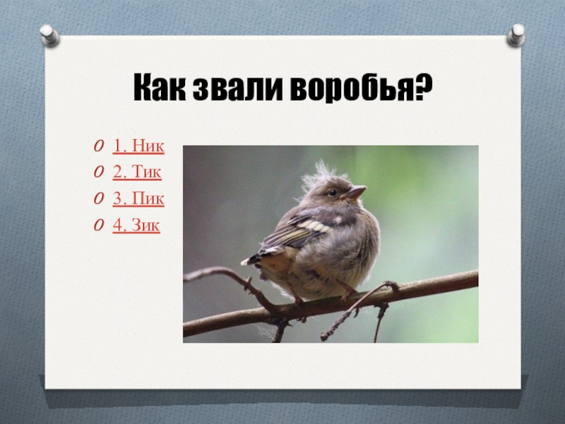 Как звали воробья?1. Ник2. Тик3. Пик4. Зик