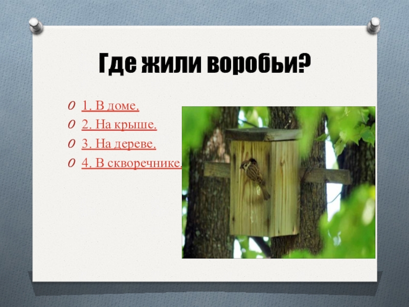 Где жили воробьи?1. В доме.2. На крыше.3. На дереве.4. В скворечнике.