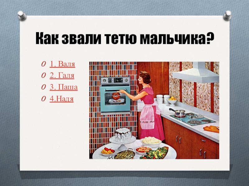 Как звали тетю мальчика?1. Валя2. Галя3. Паша4.Надя