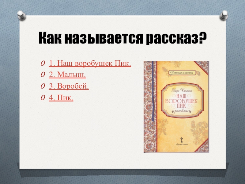 Как называется рассказ?1. Наш воробушек Пик.2. Малыш.3. Воробей.4. Пик.