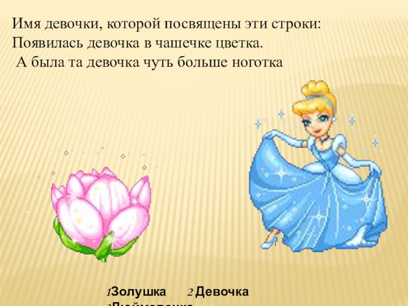 1Золушка 2 Девочка 3Дюймовочка