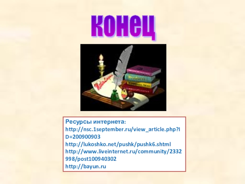 Ресурсы интернета: http://nsc.1september.ru/view_article.php?ID=200900903http://lukoshko.net/pushk/pushk6.shtmlhttp://www.liveinternet.ru/community/2332998/post100940302http://bayun.ru конец