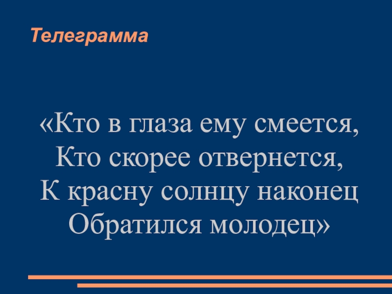 Телеграмма«Кто в глаза ему смеется,Кто скорее отвернется,К красну солнцу наконецОбратился молодец»
