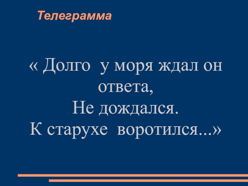 Телеграмма« Долго у моря ждал он ответа,Не дождался.К старухе воротился...»