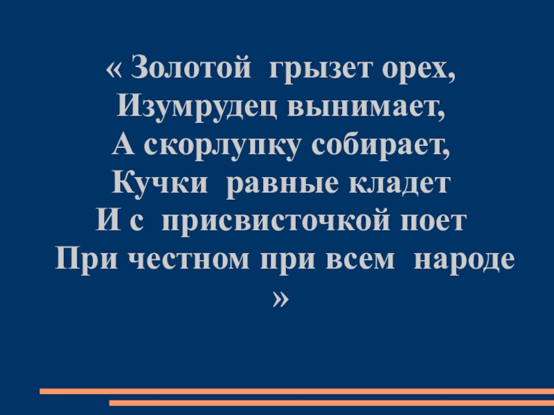 « Золотой грызет орех,   Изумрудец вынимает,   А скорлупку собирает,  Кучки равные кладетИ