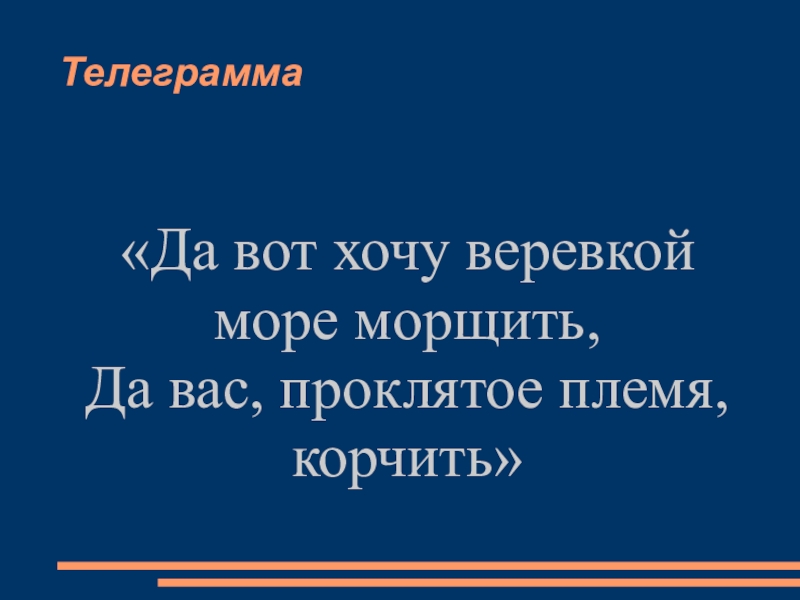 Телеграмма«Да вот хочу веревкой море морщить,Да вас, проклятое племя, корчить»