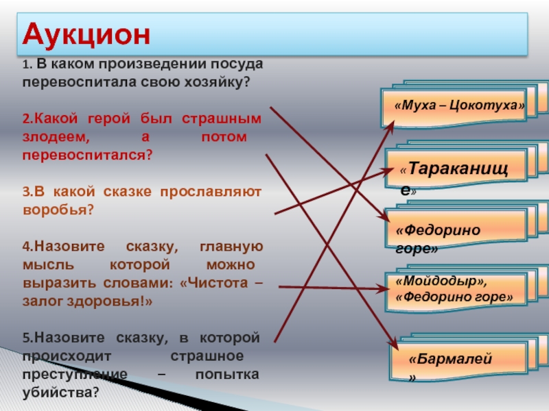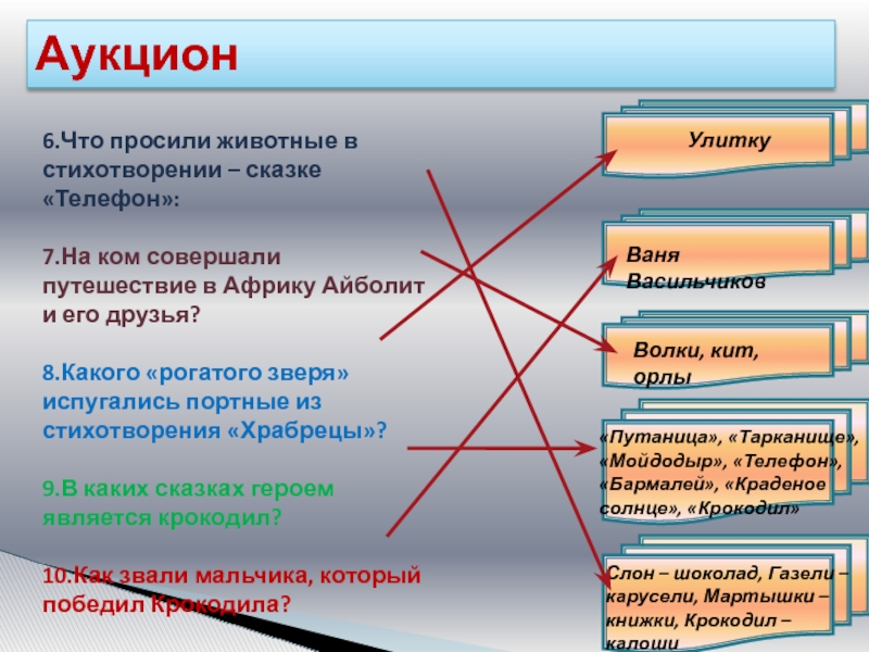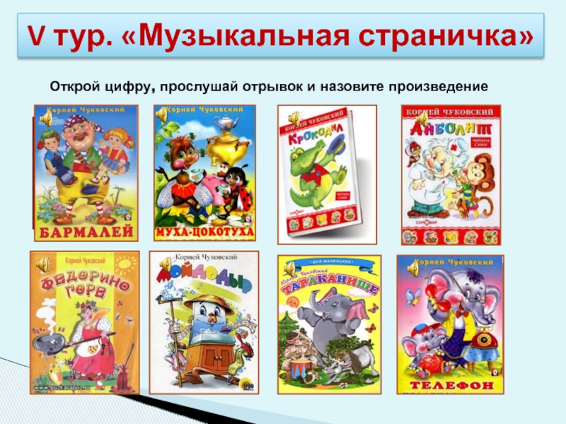 «Путаница», «Тарканище», «Мойдодыр», «Телефон», «Бармалей», «Краденое солнце», «Крокодил»