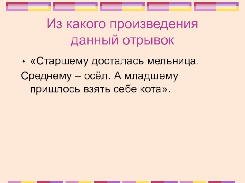 Из какого произведения данный отрывок«Старшему досталась мельница.Среднему – осёл. А младшему пришлось взять себе кота».