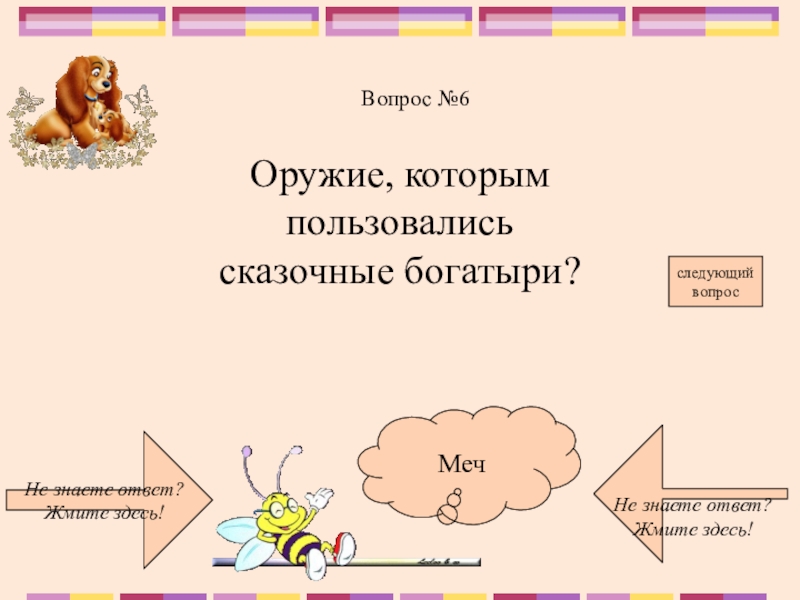 Не знаете ответ?Жмите здесь!Не знаете ответ?Жмите здесь!следующий вопросВопрос №6Оружие, которым пользовались сказочные богатыри?