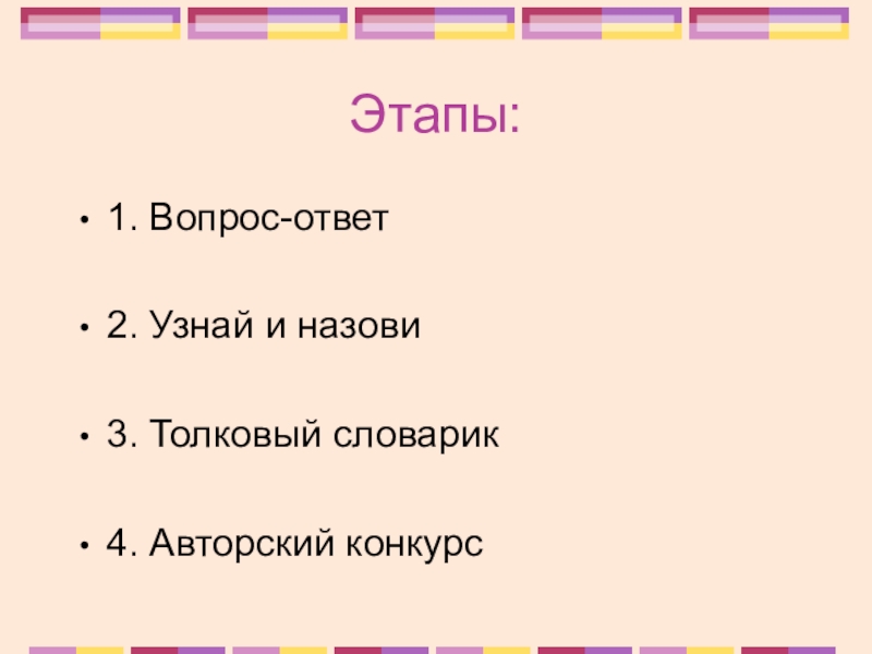Этапы:1. Вопрос-ответ2. Узнай и назови3. Толковый словарик4. Авторский конкурс