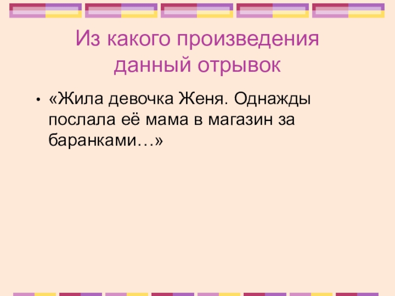Из какого произведения данный отрывок«Жила девочка Женя. Однажды послала её мама в магазин за баранками…»