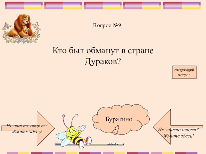 Не знаете ответ?Жмите здесь!Не знаете ответ?Жмите здесь!следующий вопросВопрос №9Кто был обманут в стране Дураков?