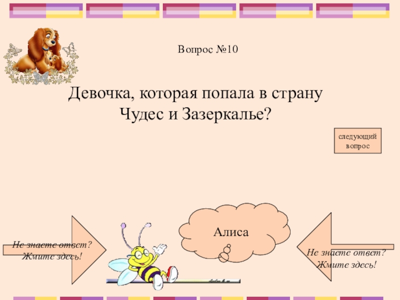 Не знаете ответ?Жмите здесь!Не знаете ответ?Жмите здесь!следующий вопросВопрос №10Девочка, которая попала в страну Чудес и Зазеркалье?