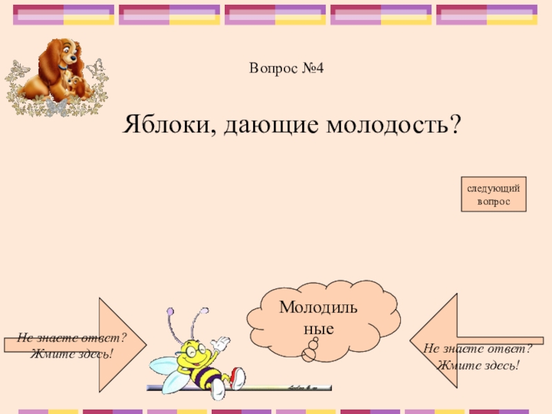 Не знаете ответ?Жмите здесь!Не знаете ответ?Жмите здесь!следующий вопросВопрос №4Яблоки, дающие молодость?